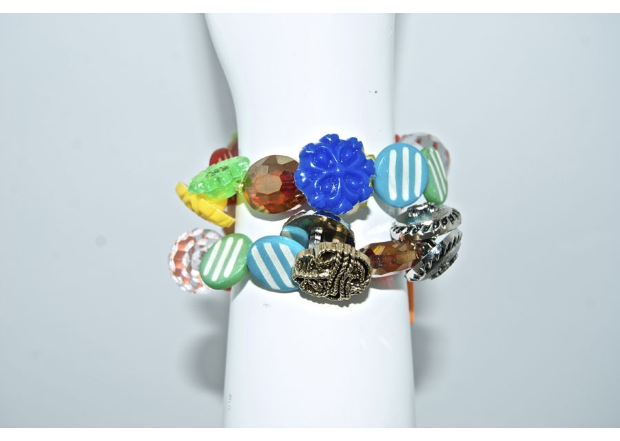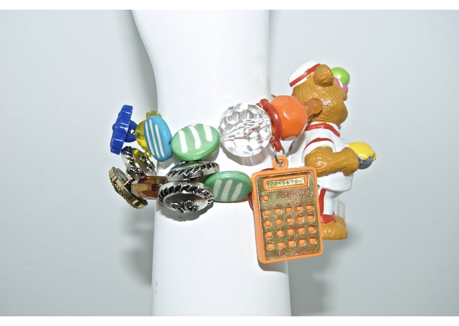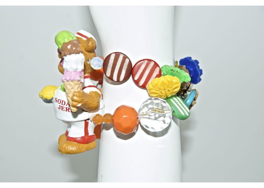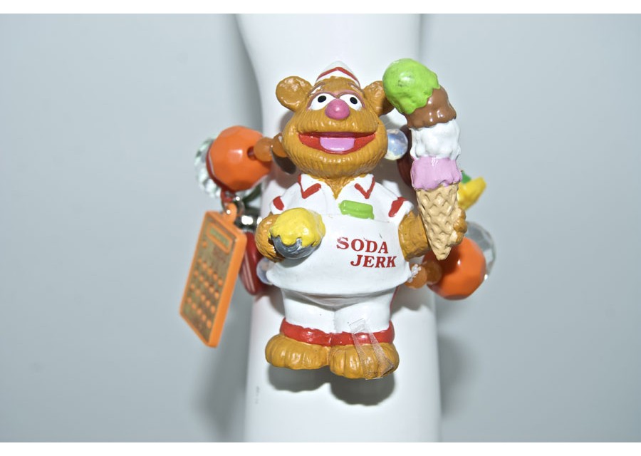 Vintage 80's figurine is made of PVC plastic and is approx. 3" tall and 2" wide Decorated with quarts, glass, crystal, fine gems, vintage charms, stones, and vintage beads.