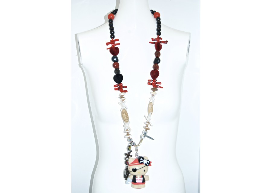 Collector figurine is made of plastic and Approx. 3 inches tall and 2 inches wide. Decorated with glass, pearls, crystal, vintage beads, coral, fine gems, recycled coconut and seashells. Necklace is approx. 34 inches long with Silver lobster claw closure. Doll is attachable from necklace. This is a one-of-a-kind Alter Ego collectible.