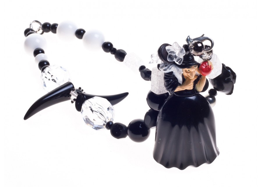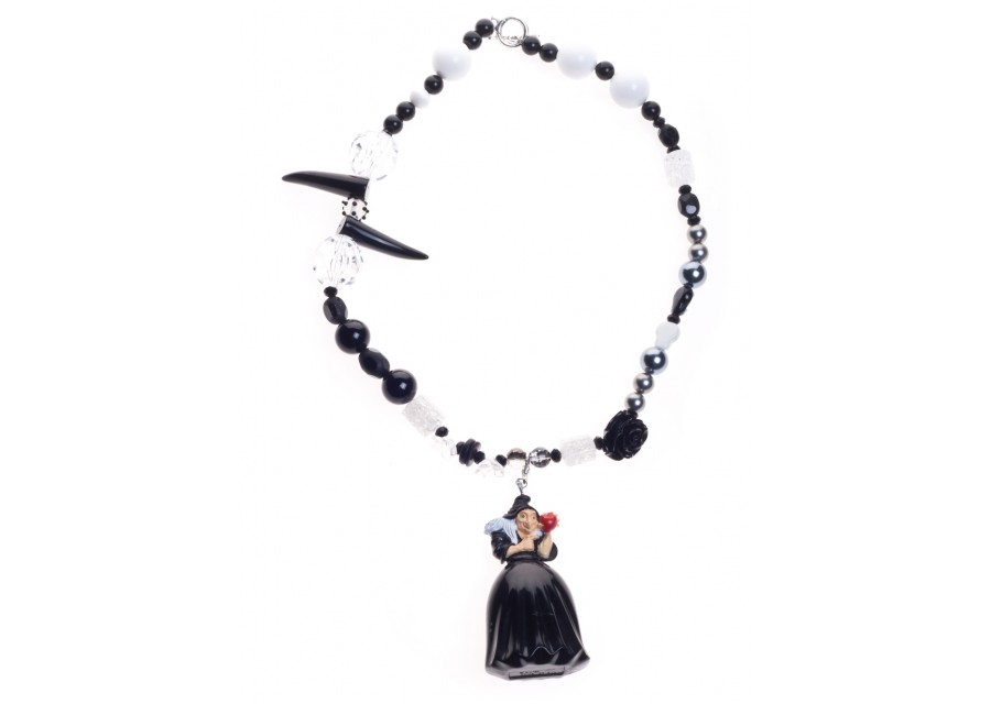 Vintage collector figurine is made of plastic. Approx. 4 inches tall and 2 inches wide. Decorated with vintage beads, glass, pearls, faceted stone, onyx, hand carved roses, recycled coconut and shattered glass. Necklace is approx. 40 inches long with Silver toggle closure. Toy is attachable from necklace. This is a one-of-a-kind Alter Ego collectible.
