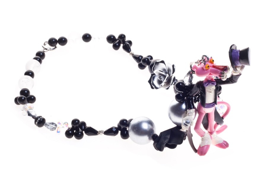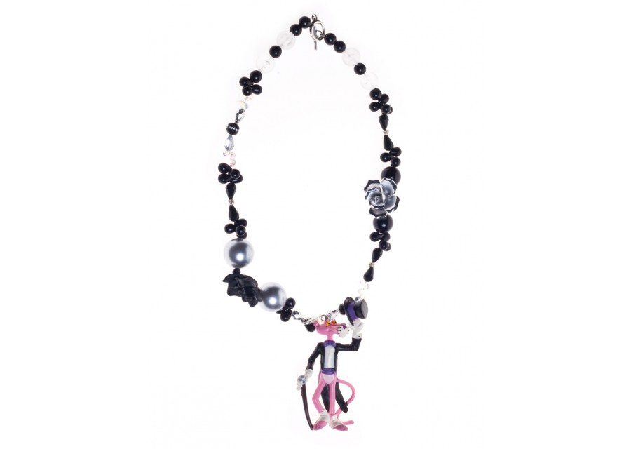 Vintage collector figurine is made of plastic. Approx. 5 inches tall and 3 inches wide. Decorated with vintage beads, glass, crystals, hand carved roses, mother of pearl, onyx. Necklace is approx. 40 inches long with Silver toggle closure. Toy is attachable from necklace. This is a limited edition Alter Ego collectible.
