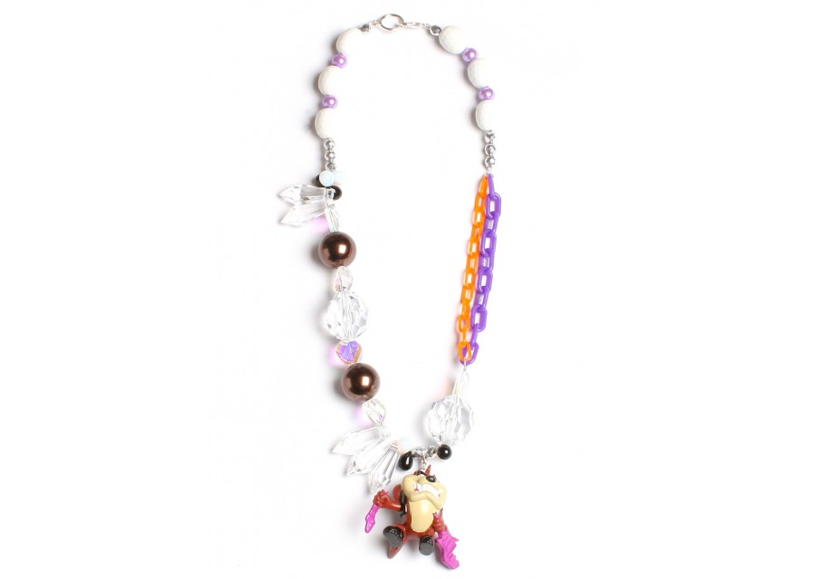 Vintage Looney Tunes™ Tasmenian figurine is made of PVC plastic and is approx. 2 inches tall and 2 1/2 inches wide. Decorated with crystals, faux pearls, lucite and vintage beads and chain.Necklace is approx. 27 inches long with silver lobster claw closure. Toy is attachable from necklace. Looney Tunes™ Collection by Erika Walton™.