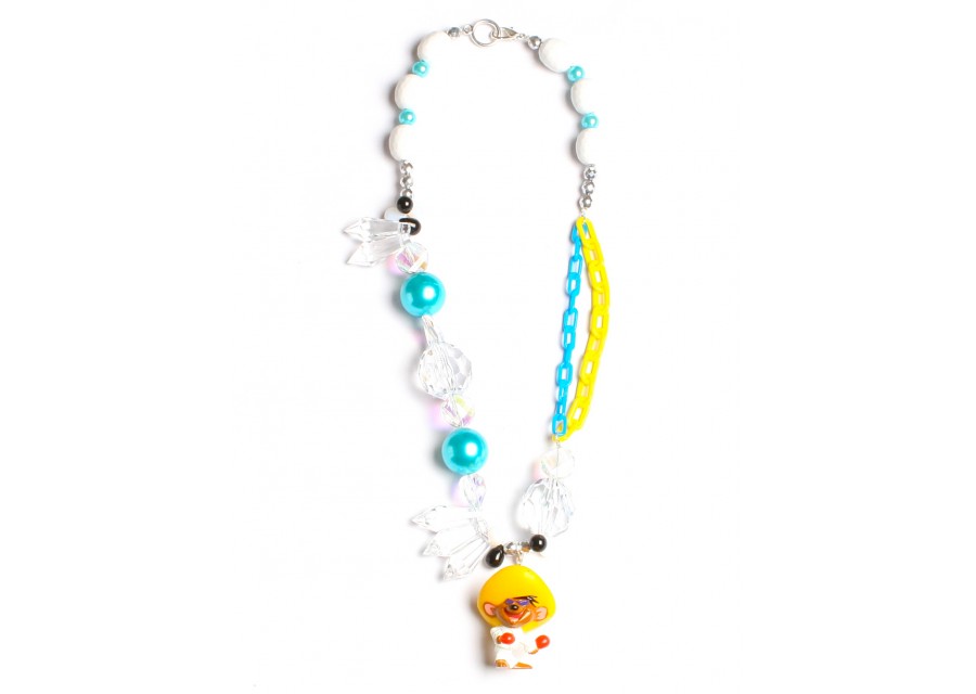Vintage Looney Tunes™ Speedy Gonzalez figurine is made of PVC plastic and is approx. 2 inches tall and 2 inches wide. Decorated with crystals, faux pearls, lucite and vintage beads and chain. Necklace is approx. 27 inches long with silver lobster claw closure. Toy is attachable from necklace. Looney Tunes™ Collection by Erika Walton™. Handmade in the USA