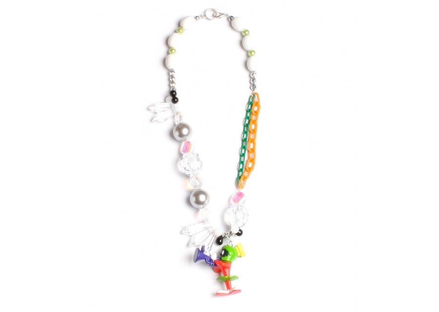 Vintage Looney Tunes™ Marvin The Martian figurine is made of PVC plastic and is approx. 2 1/2 inches tall and 2 1/2 inches wide. Decorated with crystals, faux pearls, lucite and vintage beads and chain. Necklace is approx. 27 inches long with silver lobster claw closure. Toy is attachable from necklace. Looney Tunes™ Collection by Erika Walton™. Handmade in the USA