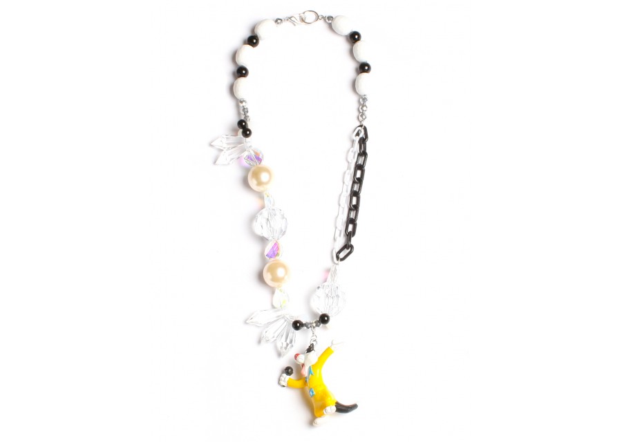 Vintage Looney Tunes™ Sylvester figurine is made of PVC plastic and is approx. 2 1/2 inches tall and 3 inches wide. Decorated with crystals, plastic chain, faux pearls and plastic beads. Necklace is approx. 27 inches long with silver lobster claw closure. Toy is attachable from necklace. Looney Tunes™ Collection by Erika Walton™. Handmade in the USA
