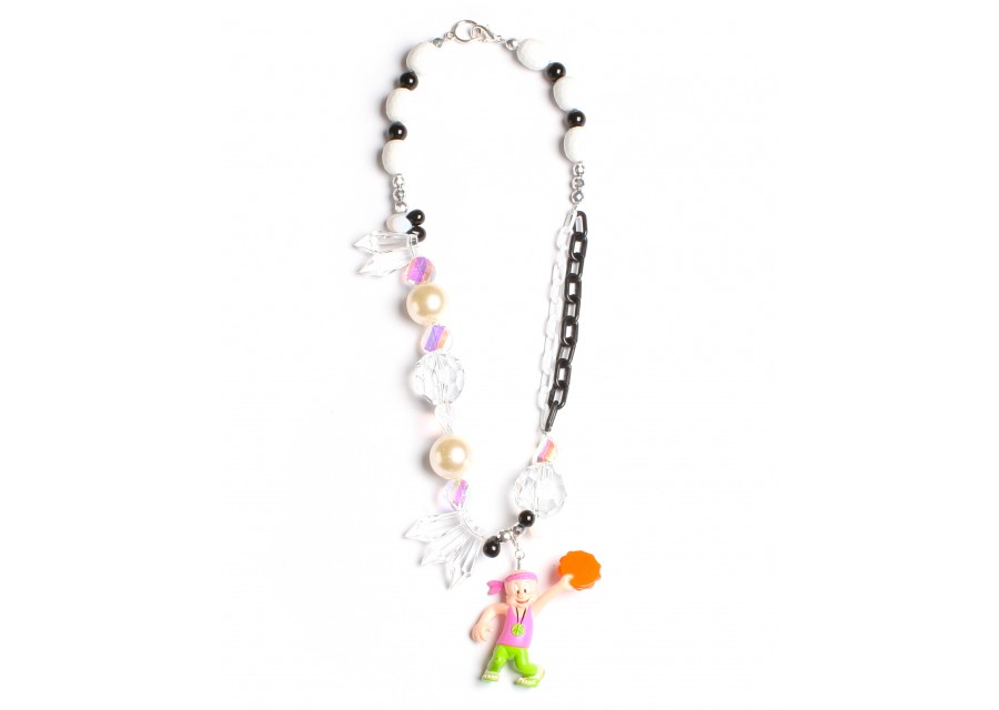 Vintage Looney Tunes™ Elmer Fudd figurine is made of PVC plastic and is approx. 3 inches tall and 2 1/2 inches wide. Decorated with crystals, faux pearls, lucite and vintage beads and chain. Necklace is approx. 27 inches long with silver lobster claw closure. Toy is attachable from necklace. Looney Tunes™ Collection by Erika Walton™. Handmade in the USA