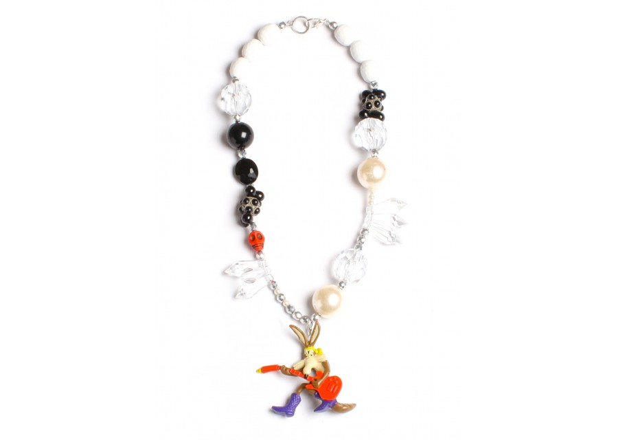 Vintage Looney Tunes™ Wile E. Coyote figurine is made of PVC plastic and is approx. 3 inches tall and 3 inches wide. Decorated with crystals, faux pearls, glass, silver plated onyx beads, lucite, dyed turquoise and onyx. Necklace is approx. 27 inches long with silver lobster claw closure. Toy is attachable from necklace. Looney Tunes™ Collection by Erika Walton™