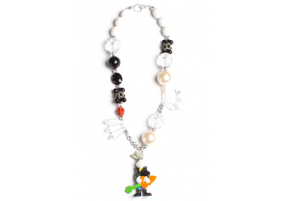 Vintage Looney Tunes™ Bugs Bunny figurine is made of PVC plastic and is approx. 3 1/2 inches tall and 2 1/2 inches wide. Decorated with crystals, faux pearls, glass, silver plated onyx beads, lucite, dyed turquoise and onyx. Necklace is approx. 27 inches long with silver lobster claw closure. Toy is attachable from necklace. Looney Tunes™ Collection by Erika Walton™