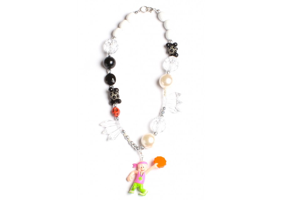 Vintage Looney Tunes™ Elmer Fudd figurine is made of PVC plastic and is approx. 3 inches tall and 2 1/2 inches wide. Decorated with crystals, faux pearls, glass, silver plated onyx beads, lucite, dyed turquoise and onyx. Necklace is approx. 27 inches long with silver lobster claw closure. Toy is attachable from necklace. Looney Tunes™ Collection by Erika Walton™