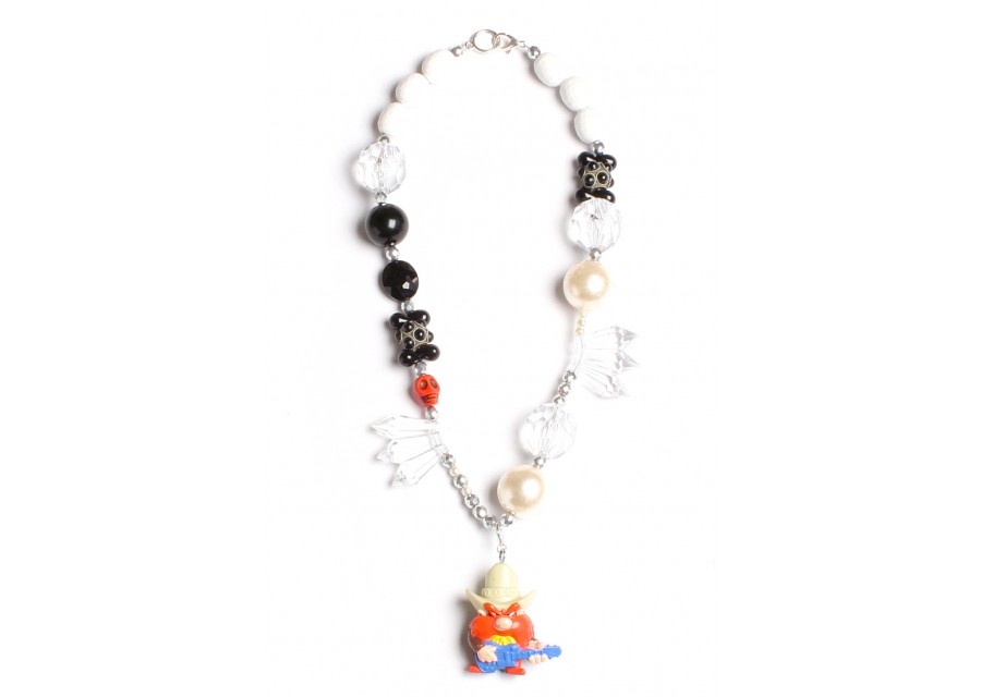 Vintage Looney Tunes™ Yosemite Sam figurine is made of PVC plastic and is approx. 2 1/2 inches tall and 2 inches wide. Decorated with crystals, faux pearls, glass, silver plated onyx beads, lucite, dyed turquoise and onyx. Necklace is approx. 27 inches long with silver lobster claw closure. Toy is attachable from necklace. Looney Tunes™ Collection by Erika Walton™